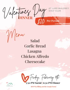Valentine’s Day Dinner by foreUPwebsites | Jan 17, 2023 | Club News Bring your sweetheart out to Lake Maloney Golf Course to celebrate Valentine’s Day! 🖤 Fill out the form to register!
